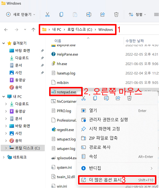1. 내 PC > C 드라이브 > Windows 폴더에 들어 갑니다. → notepad.exe에서 오른쪽 마우스를 클릭합니다. → 더 많은 옵션 표시를 클릭합니다.