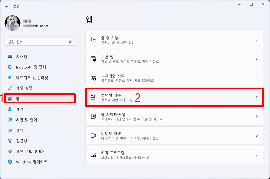 1. 윈도우키+i 키를 누른 후 → 앱 → 선택적 기능을 클릭합니다.