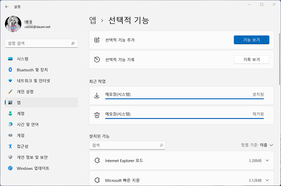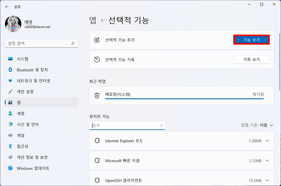 3. 최근 작업에 메모장(시스템) 제거됨이 뜨면 제대로 삭제가 된 것입니다. → 기능 보기를 클릭합니다.