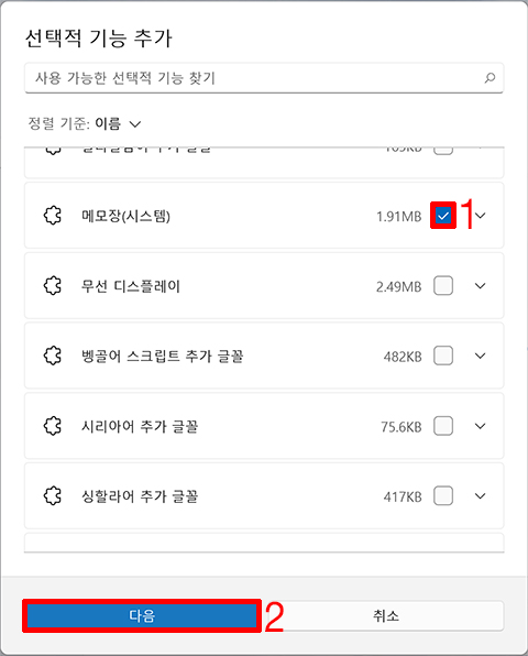4. 메모장(시스템)에 체크를 합니다. → 다음 버튼을 클릭합니다.