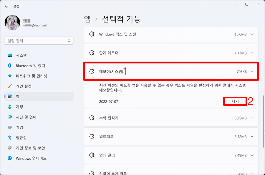 2. 메모장(시스템) → 제거를 클릭합니다.